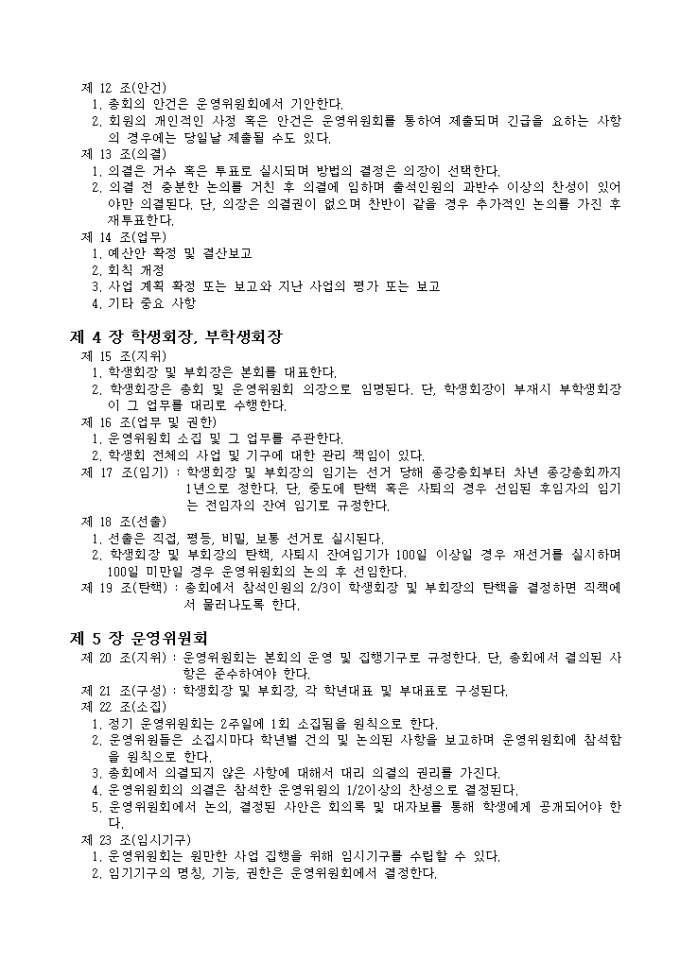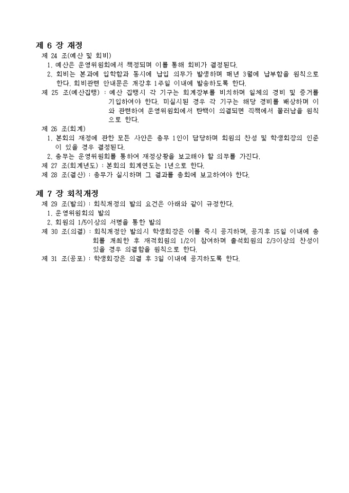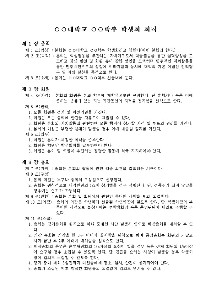 9,000원/월대학교 학부 혹은 학과 등에 규정한 회칙으로 총 7장, 31조의 항목으로 구성된 서식입니다.