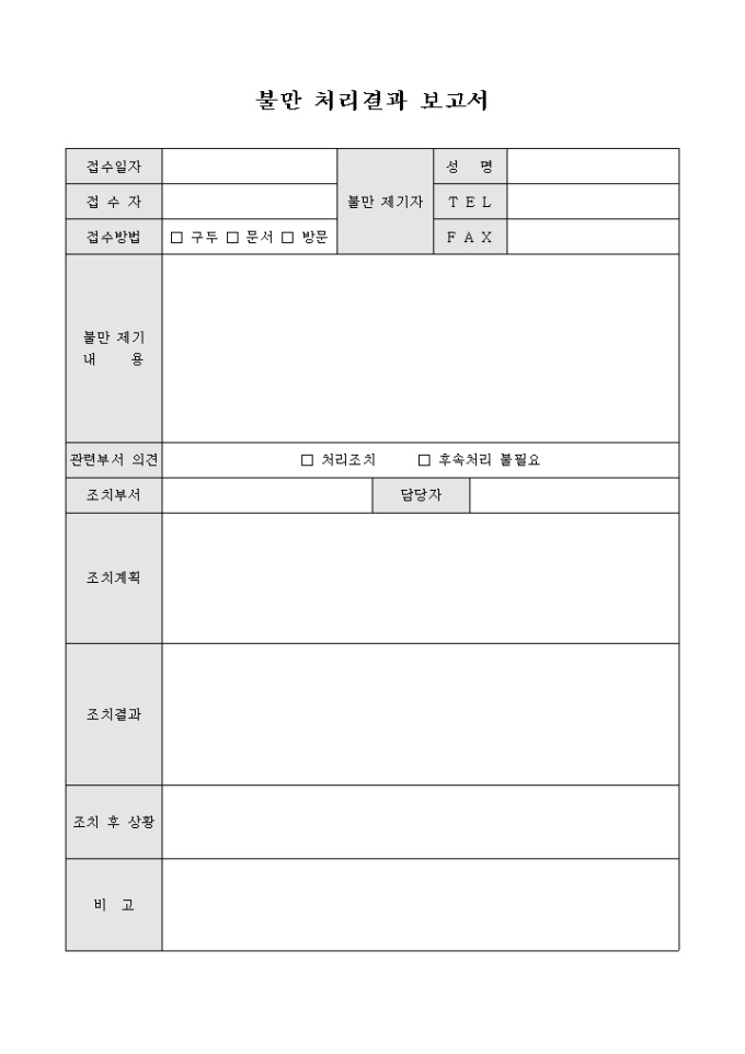 9,000원/월고객이 제시한 불만사항을 접수한 후 불만 내용 및 조치 계획, 결과 등을 작성하여 상급자에게 보고 토록 하는 불만 처리결과 보고서 양식입니다.