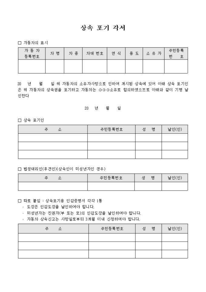 9,000원/월자동차의 소유자가 사망으로 인하여 개시된 상속권을 상속인이 포기하고자 할 때 사용하는 서식으로 자동차의 정보와 상속포기인 정보 등을 기록합니다.