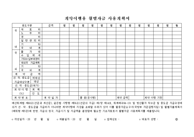 9,000원/월예산회계법 제68조(선금과 개산금), 같은법 시행령 제56조(선금의 지급) 제1항 제14호, 회계예규04-131 및 방산물자 착수금 및 중도금 지급규정에 의거 선·착·중도금을 지급하지 아니하면 계약이행에 지장을 초래할 우려가 있어 이를 월중자금요구서 및 월별지출계획서에 반영. 지급의 청구, 지급시기 및 지급액을 결정함에 필요한 기초자료로서 제출하는 계약이행용 월별자금 사용계획서 양식입니다.