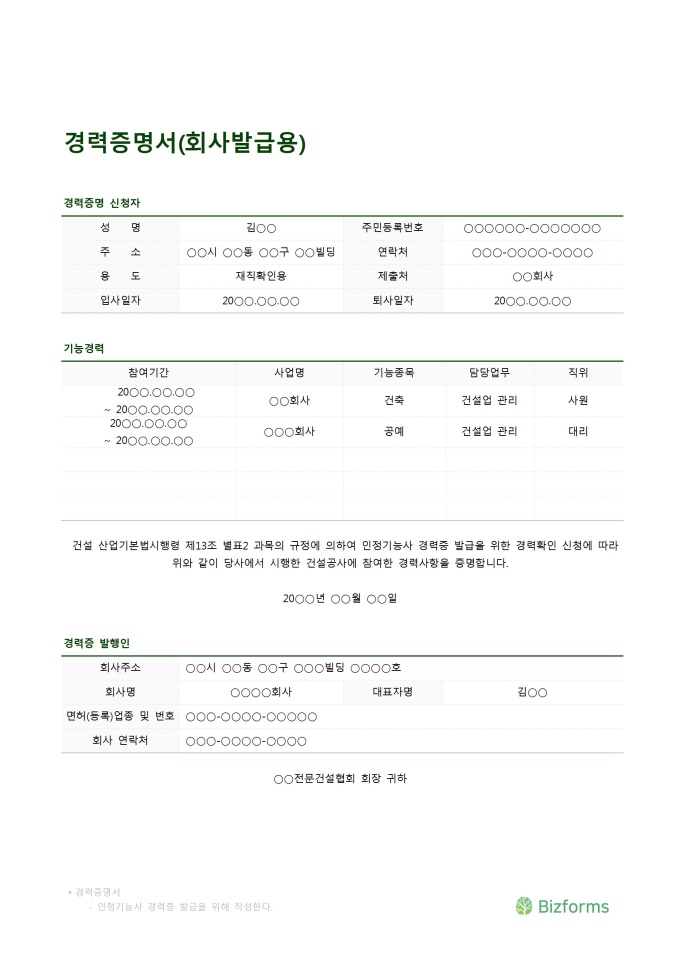9,000원/월별지 제2호 서식 건설산업기본법시행령 제13조 별표2 라목의 규정에 의하여 인정기능사 경력증 발급을 위한 경력확인 신청에 따라 회사에서 시행한 건설공사에 참여한 경력사항을 증명할 때 사용하는 양식입니다.