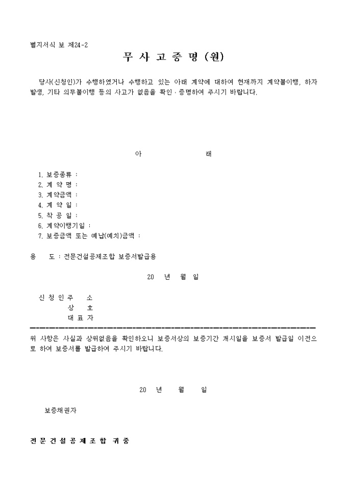 9,000원/월별지서식 보 제24-2 신청인이 수행하였거나 수행하고 있는 제시된 계약에 대하여 현재까지 계약불이행, 하자발생, 기타 의무불이행 등의 사고가 없음을 확인 증명할 때 사용하는 양식입니다.