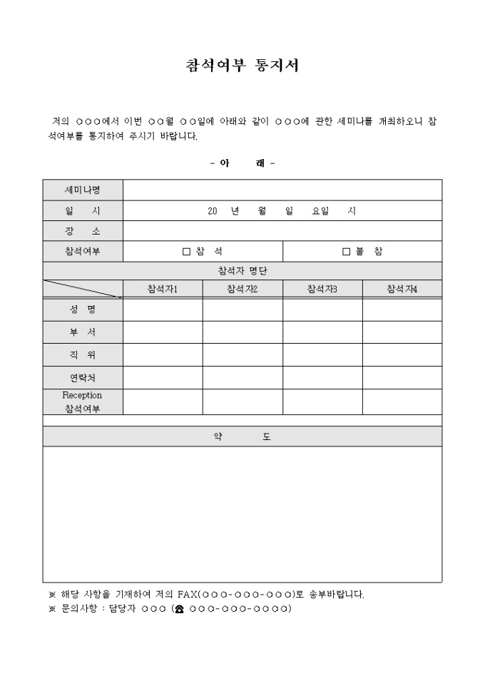 9,000원/월회사에서 주체하는 세미나에 참석여부를 통지해달라는 내용의 통지서 양식입니다. 세미나의 일정과 참석자 유무, 참석자의 인적사항 등을 기재할 수 있도록 구성되어 있습니다.