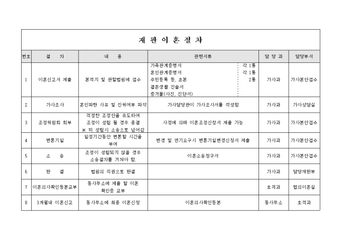 9,000원/월재판이혼시 진행절차별 준비서류와 제출처등을 한눈에 확인 할 수 있도록 구성된 재판이혼 진행절차표 입니다.