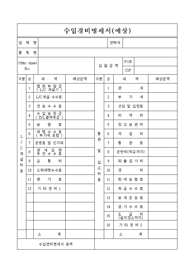 9,000원/월업체명, 품목명, 내역, 예상금액 등으로 구성된 수입경비 명세서입니다
