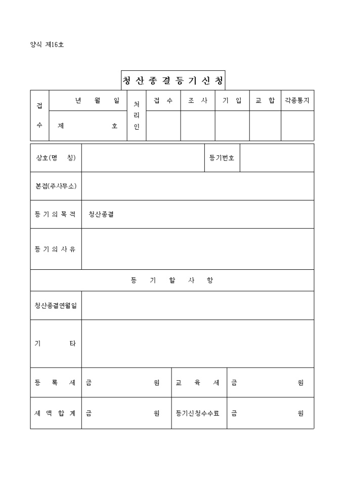 9,000원/월양식 제16호 청산종결등기신청서 입니다. 등기의 목적 청산종결...