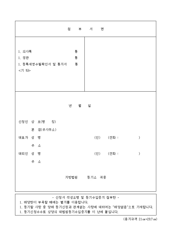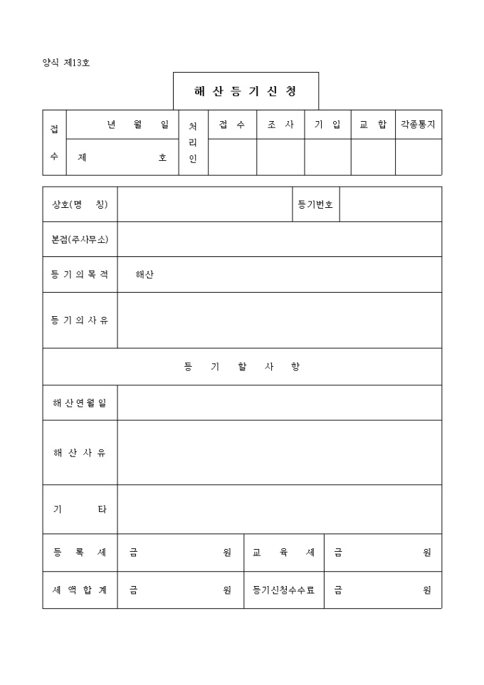 9,000원/월양식 제13호 해산등기신청서 입니다. 등기의 목적이 해산일 경우 사용하는 양식입니다.
