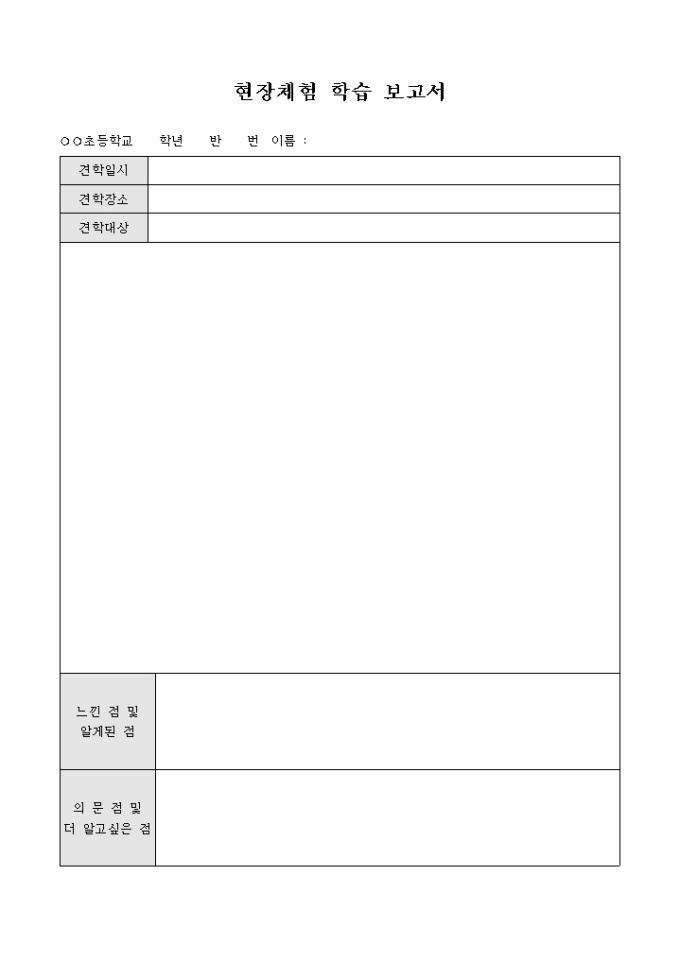 9,000원/월초등학생이 현장 체험 학습을 한 후 보고서를 작성 할 때 사용할 수 있도록 제작된 서식으로 견학내용 및 체험 사진을 부착하여 학습 내용을 기록할 수 있습니다.