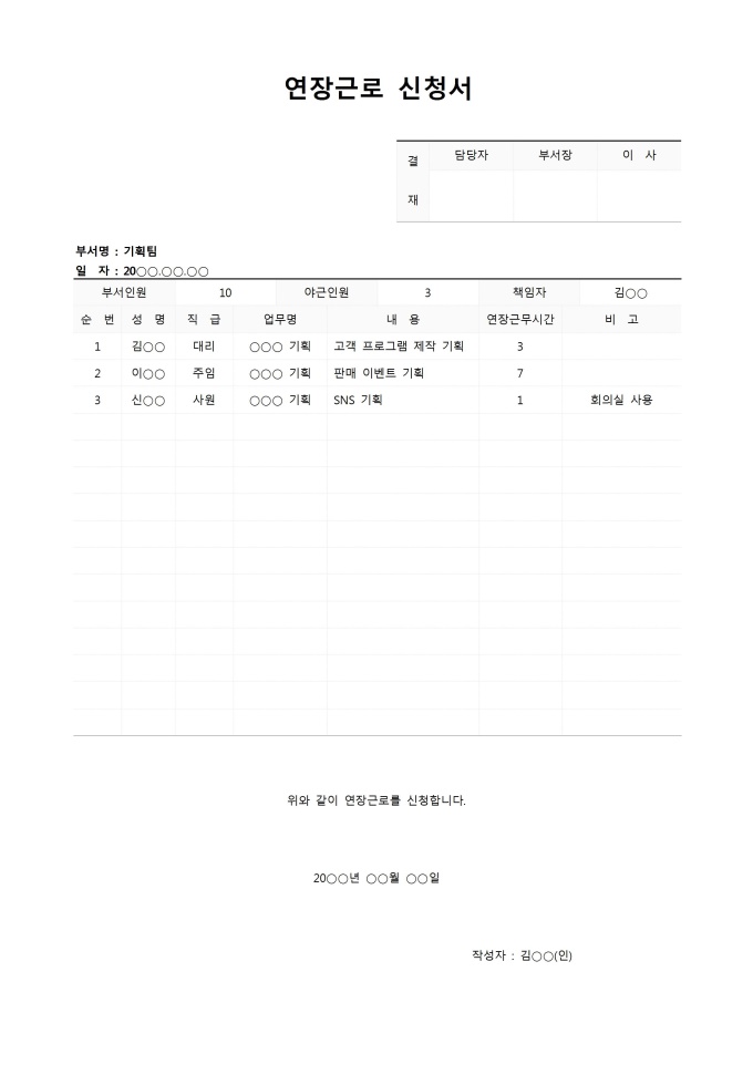 9,000원/월해당 부서에서 업무상의 이유로 연장근로를 신청할 때 작성하는 연장근로 신청서 양식입니다. 근로인원의 직급, 성명, 업무명, 주요 업무내용, 연장근무시간 등의 항목으로 구성되어 있습니다.