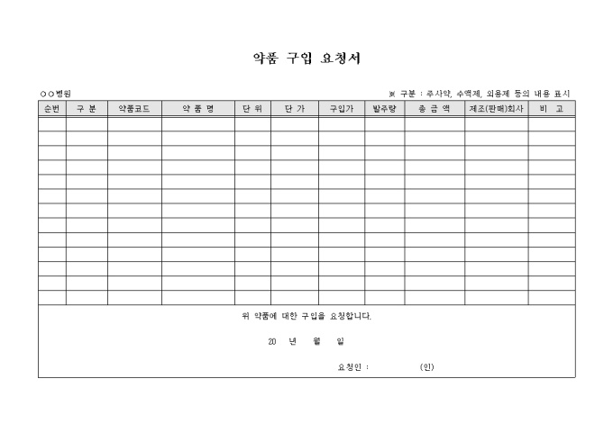 9,000원/월병원에서 사용할 약품에 대한 구입을 요청하는 약품 구입요청서 양식입니다. 약품코드 및 약품명, 단위, 단가, 발주량, 총금액, 제조회사 등의 항목에 대하여 기재할 수 있습니다.