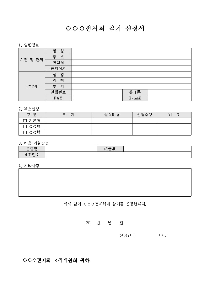 9,000원/월전시회에 참가하기 위해 작성하는 참가신청서 양식으로 참가자의 일반정보와 전시 부스신청, 전시계획서 등의 내용을 기재할 수 있도록 구성되어 있습니다.