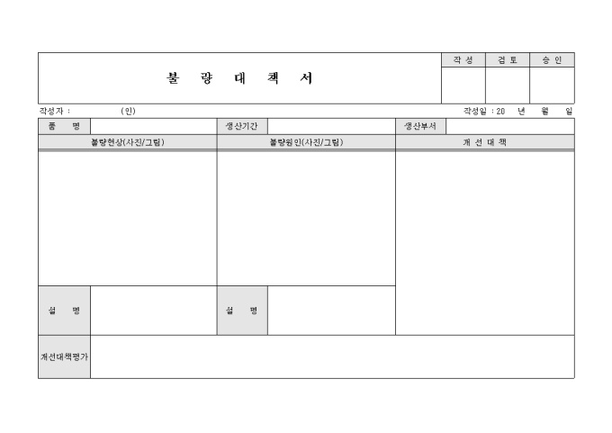 9,000원/월생산하고 있는 품목에 대하여 불량이 발생하였을 경우 불량내용에 대한 개선대책을 기재하는 불량대책서 양식입니다. 불량현상 및 불량원인에 대하여 사진 또는 그림을 첨부하여 해당 설명을 기재하고 개선대책을 작성할 수 있도록 구성되어 있습니다.