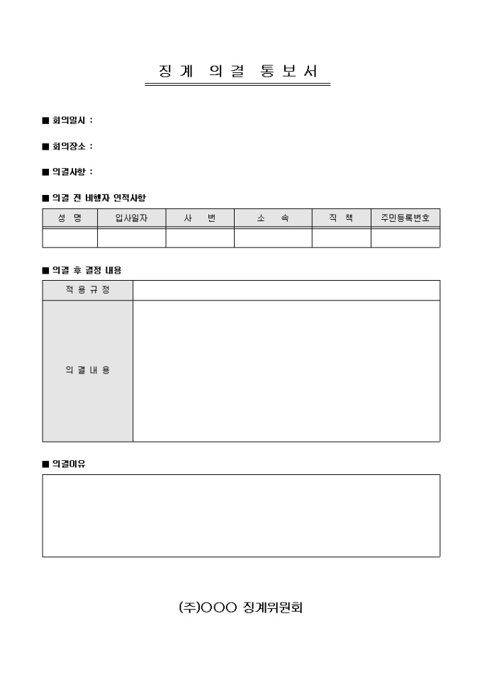 9,000원/월징계위원회 의결 결과를 통보할 때 사용할 수 있는 징계 의결 통보서입니다. 회의일시, 회의장소, 의결사항, 의결 후 결정 내용 등의 항목으로 구성되어있습니다.