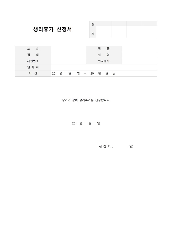 9,000원/월근로기준법에 근거하여 한달에 1회 실시할 수 있는 생리휴가를 여성사원이 희망하여 이를 신청하고자 할 경우 사용할 수 있도록 제작된 서식입니다.