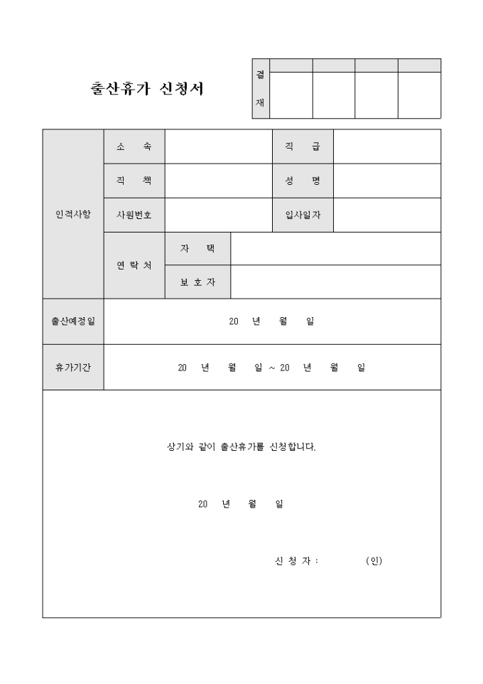 9,000원/월회사에 소속된 여성 사원이 출산 예정일에 맞추어 90일의 출산휴가를 신청하고자 할 경우 사용할 수 있도록 제작된 서식입니다.