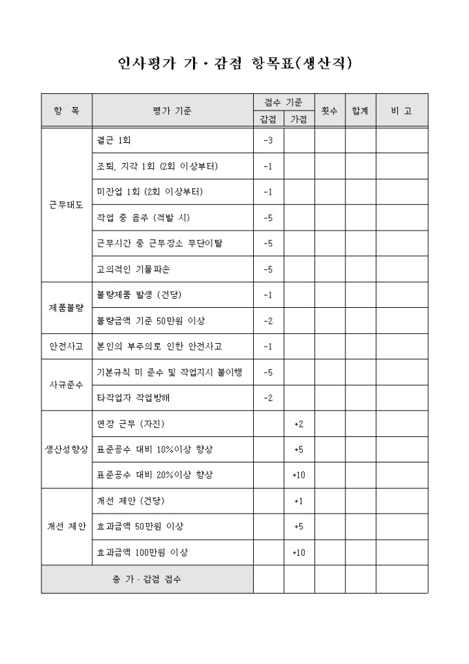 9,000원/월생산직에 대한 인사평가시에 가점 및 감점 사항을 기록할 수 있도록 구성된 인사평가 가·감점 항목표 양식입니다.