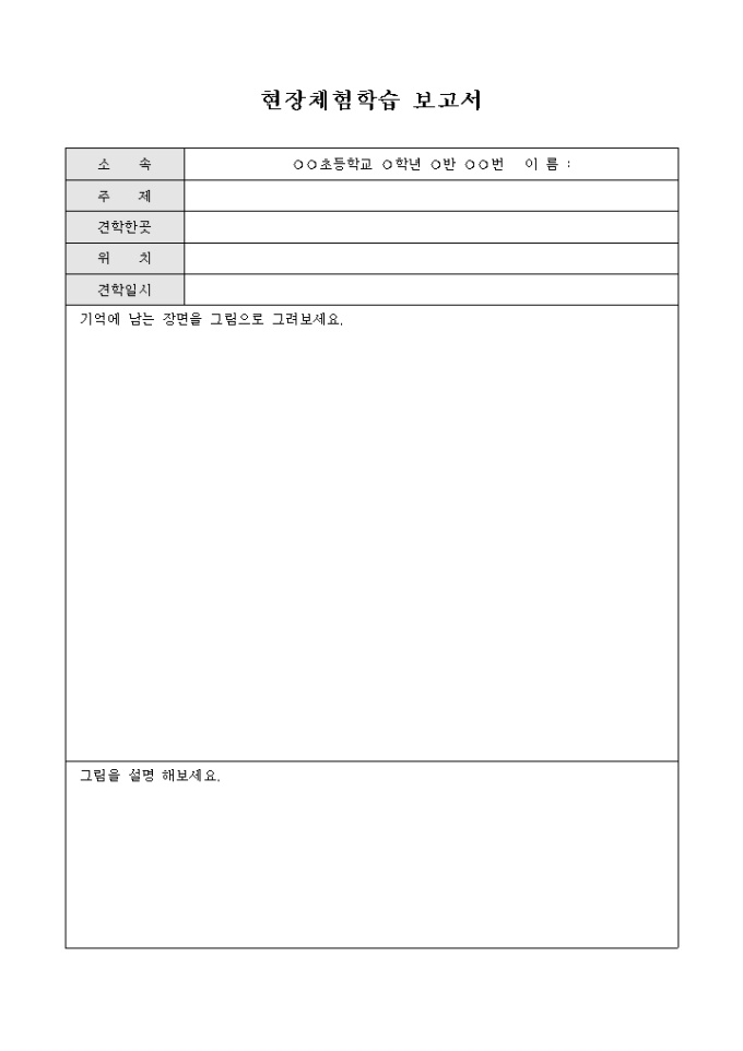 9,000원/월초등학생이 현장 체험 학습을 다녀 온 후 보고서를 작성하고자 할 때 사용하는 양식으로 기억에 남는 장면을 그림으로 그리고, 설명합니다.
