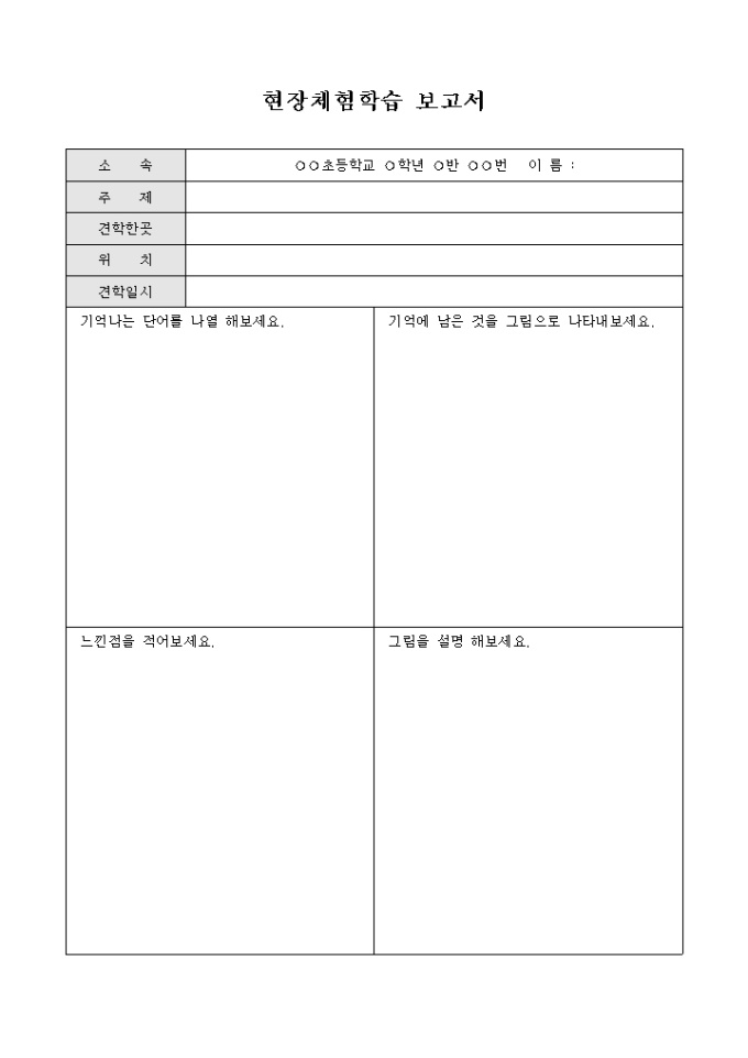 9,000원/월초등학생이 현장 체험 학습을 다녀 온 후 보고서를 작성하고자 할 때 사용하는 양식으로 기억에 남는 장면을 다양한 형태로 작성할 수 있습니다.