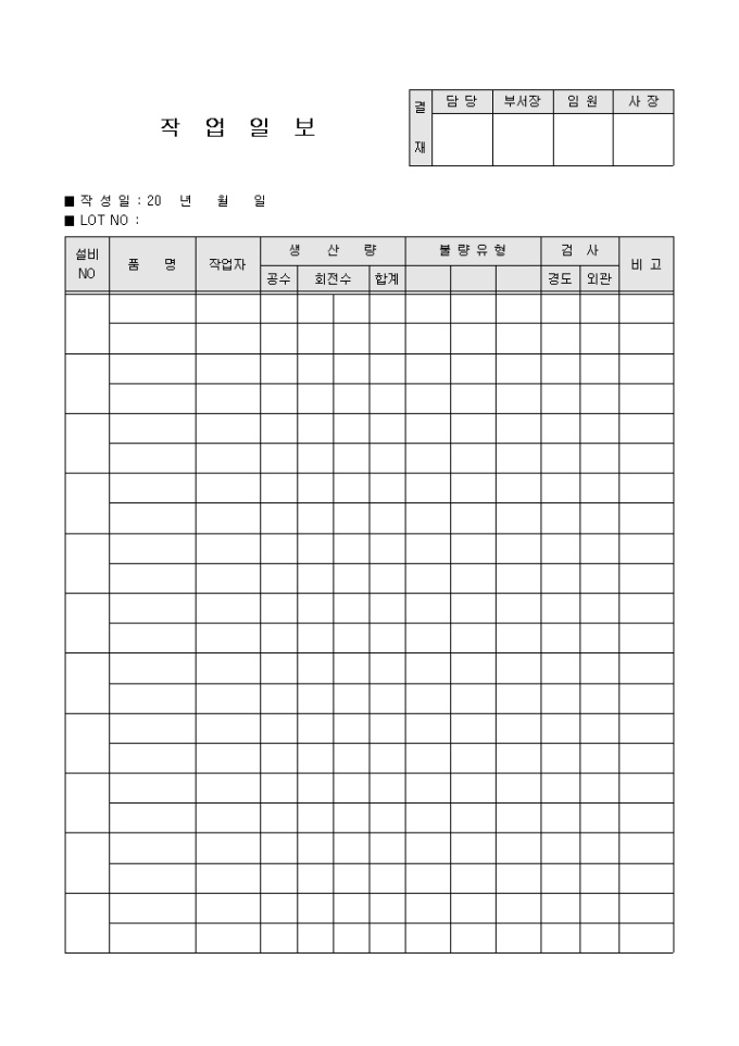 9,000원/월생산작업내역을 매일 기록/ 관리할 수 있는 생산작업일보입니다. 설비NO, 품명, 작업자, 생산량, 불량유형 등의 항목으로 구성되어있습니다.