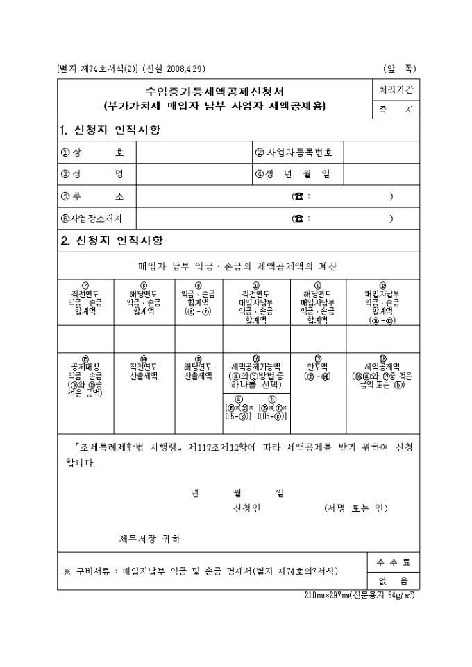 9,000원/월제74호(2) 수입증가등세액공제신청서(부가가치세매입자납부사업자세액공제용) 20080429