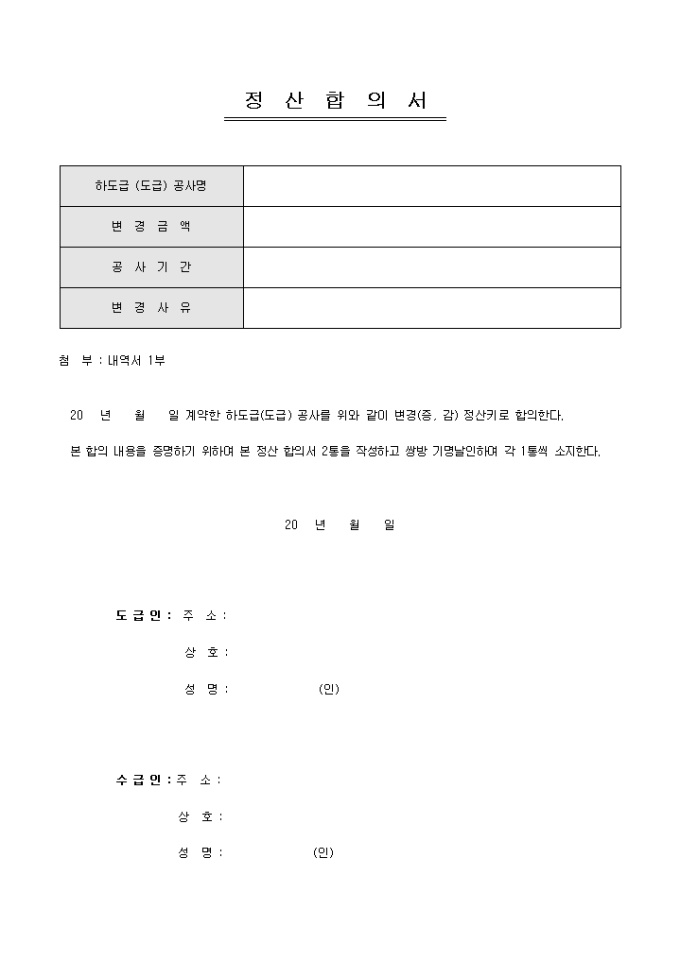 공사 변경에 관한 정산내용에 합의한다는 정산합의서입니다. 하도급 공사명, 변경금액, 공사기간 등의 항목으로 구성되어있습니다.