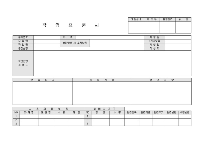 9,000원/월자재생산에 관한 작업표준서입니다. 문서번호, 모델명, 작업명, 작업진행 과정도 등의 항목으로 구성되어있습니다.