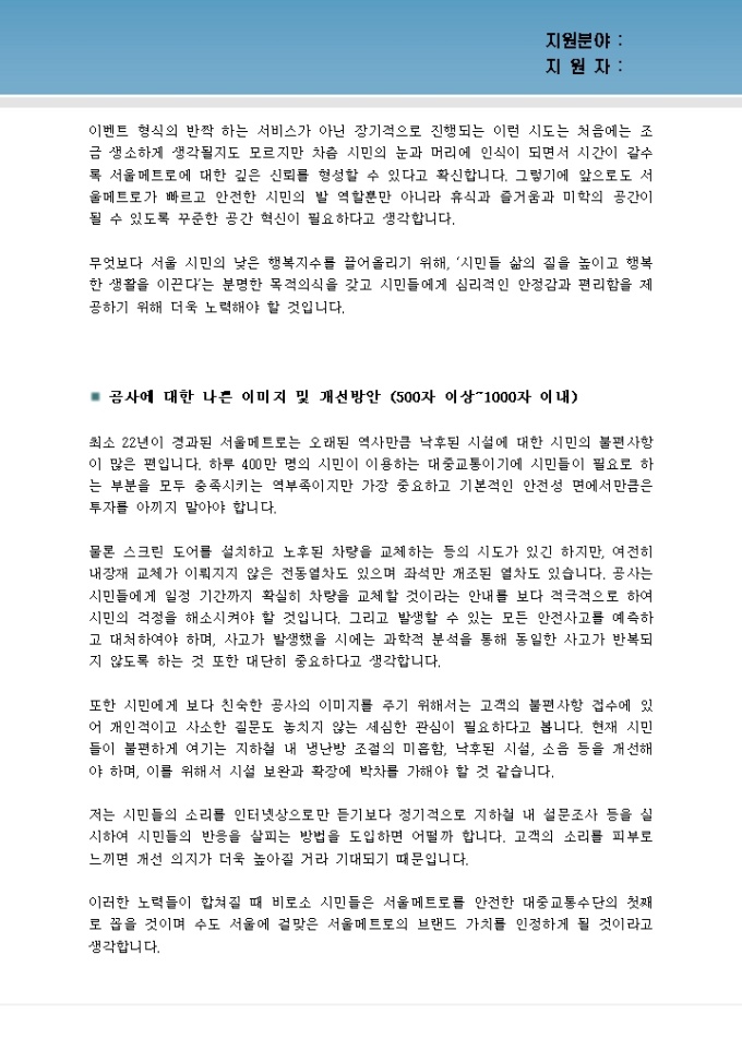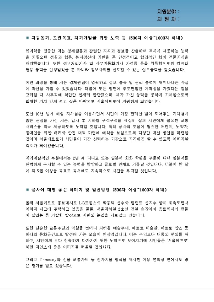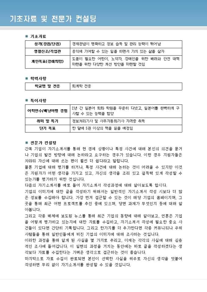9,000원/월간혹 기업이 자기소개서를 통해 현 경제 상황이나 특정 사건에 대해 본인의 의견을 묻거나 기업의 발전 방향에 대해 논하라고 요구하는 경우가 있습니다. 이런 경우 지원자들은 차라리 자신에 대해 쓰는 편이 훨씬 더 쉽다라고 말합니다. 물론 기업에 대해 평가를 하거나, 특정 사건에 대해 논하는 것이 어려울 수 있지만 이것은 지원자가 어떤 생각을 가지고 있고, 자신의 생각을 조리 있고 설득력 있게 작성할 수 있는가를 평가하기 위한 것입니다.