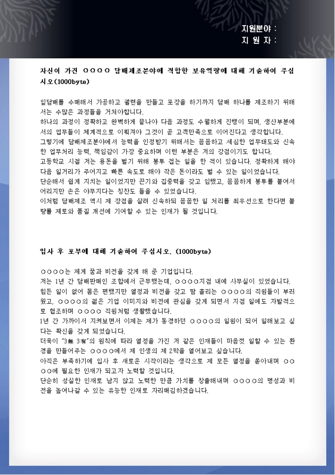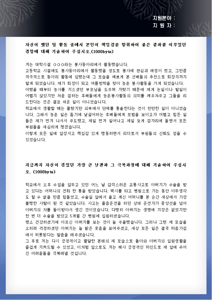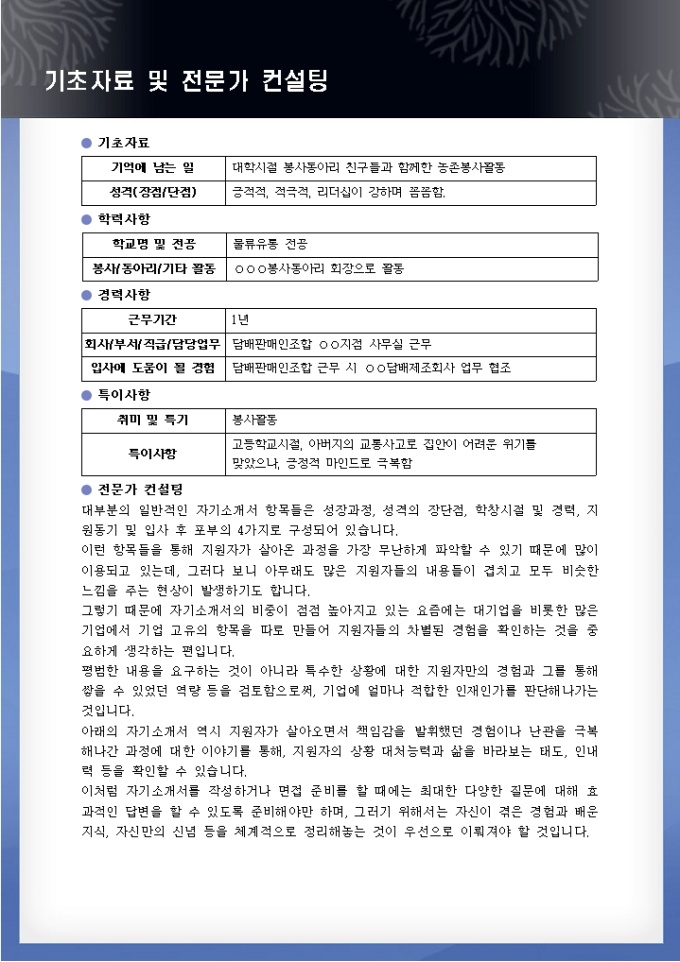 9,000원/월대부분의 일반적인 자기소개서 항목들은 성장과정, 성격의 장단점, 학창시절 및 경력, 지원동기 및 입사 후 포부의 4가지로 구성되어 있습니다. 이런 항목들을 통해 지원자가 살아온 과정을 가장 무난하게 파악할 수 있기 때문에 많이 이용되고 있는데, 그러다 보니 아무래도 많은 지원자들의 내용들이 겹치고 모두 비슷한 느낌을 주는 현상이 발생하기도 합니다. 그렇기 때문에 자기소개서의 비중이 점점 높아지고 있는 요즘에는 대기업을 비롯한 많은 기업에서 기업 고유의 항목을 따로 만들어 지원자들의 차별된 경험을 확인하는 것을 중요하게 생각하는 편입니다.