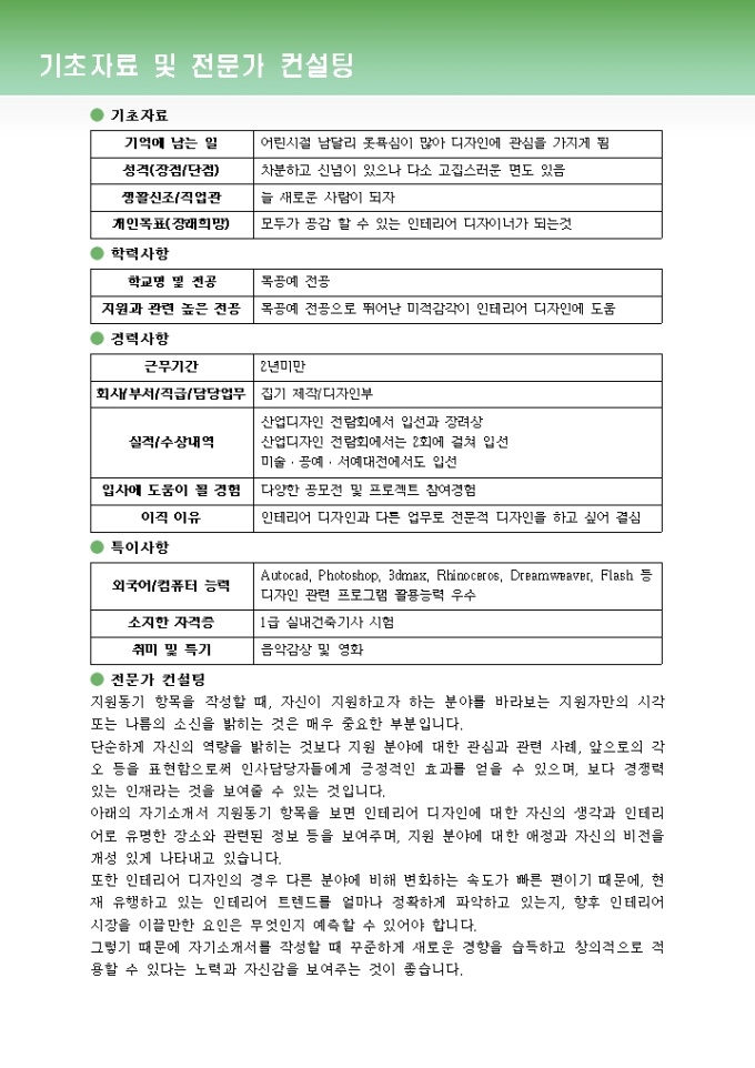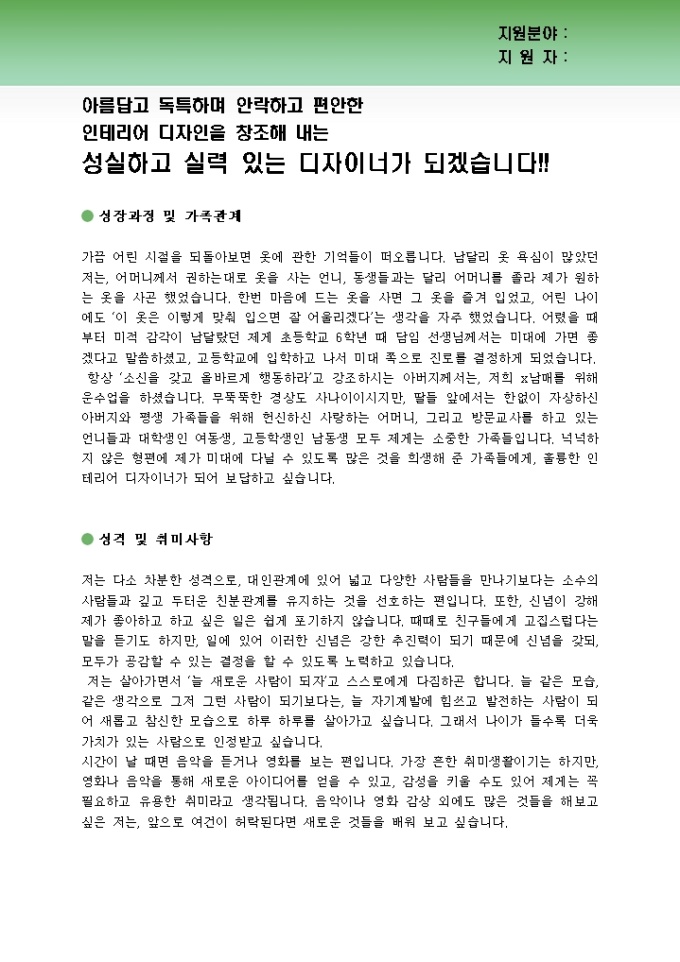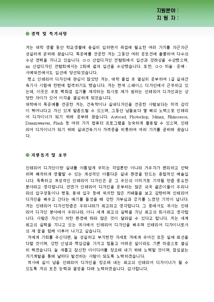 9,000원/월지원동기 항목을 작성할 때, 자신이 지원하고자 하는 분야를 바라보는 지원자만의 시각 또는 나름의 소신을 밝히는 것은 매우 중요한 부분입니다. 단순하게 자신의 역량을 밝히는 것보다 지원 분야에 대한 관심과 관련 사례, 앞으로의 각오 등을 표현함으로써 인사담당자들에게 긍정적인 효과를 얻을 수 있으며, 보다 경쟁력 있는 인재라는 것을 보여줄 수 있는 것입니다.