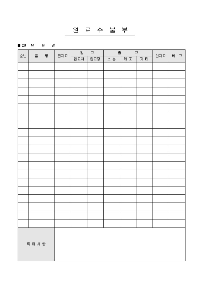 9,000원/월원료 수불현황을 기록/ 관리할 수 있는 원료수불부입니다. 순번, 품명, 전재고, 입고, 출고 등의 항목으로 구성되어있습니다.