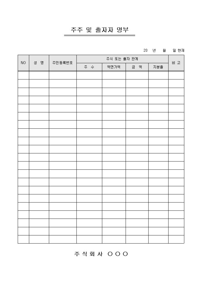 9,000원/월주주 또는 출자자 명단을 기록/ 관리할 때 사용할 수 있는 주주 및 출자자 명부입니다. 성명, 주민등록번호, 주주, 액면가액, 지분율 등의 항목으로 구성되어있습니다.