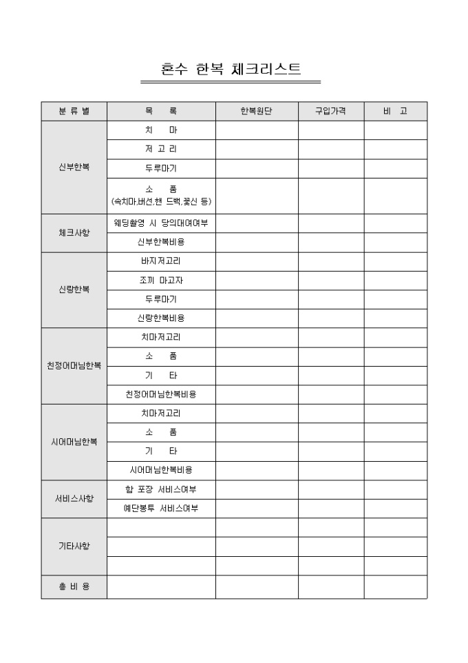 9,000원/월결혼준비 시 예단, 예물, 혼수, 한복 등에 대해 점검해 볼 수 있는 결혼준비체크리스트입니다.