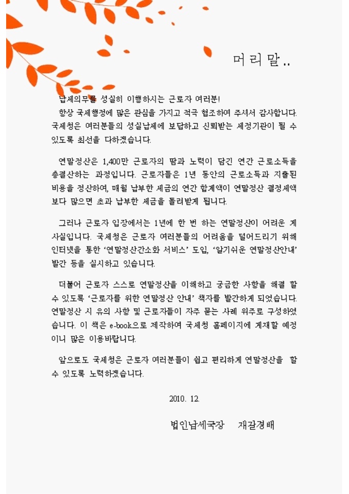 9,000원/월2010년 12월에 발간된「근로자를 위한 연말정산 안내」책자입니다.