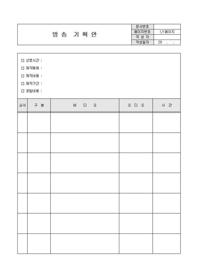 9,000원/월방송프로그램 기획 시 사용하는 방송기획안입니다. 상영시간, 제작매체, 제작내용 등의 항목으로 구성되어있습니다.