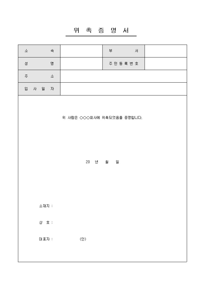 9,000원/월회사에 위촉되었음을 증명한다는 내용의 위촉증명서입니다. 성명, 주소, 입사일자 등의 항목으로 구성되어있습니다.