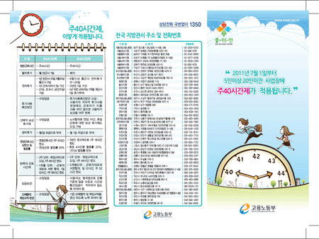 9,000원/월2011년 7월 1일 부터 5인 이상 20인 미만 사업장에 적용되는 주40시간제 리플렛 입니다.