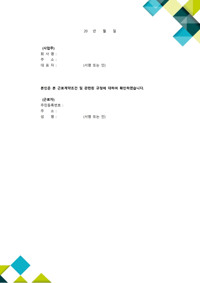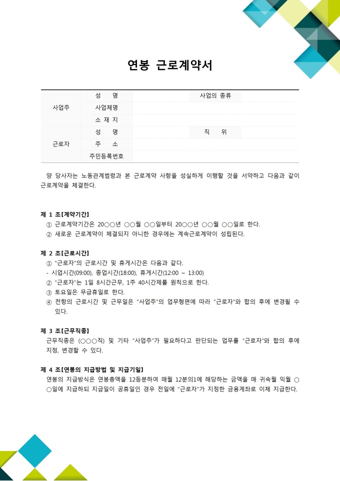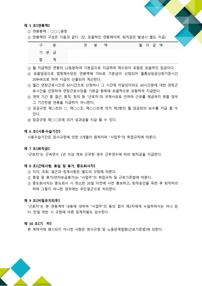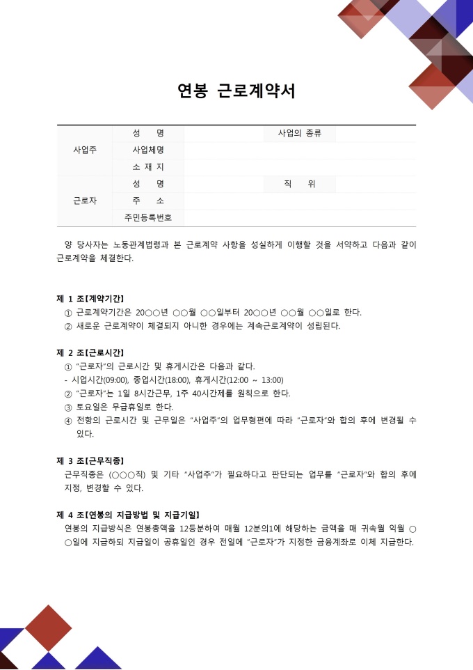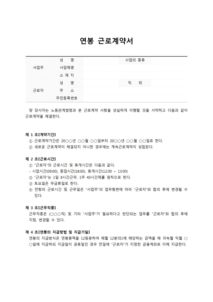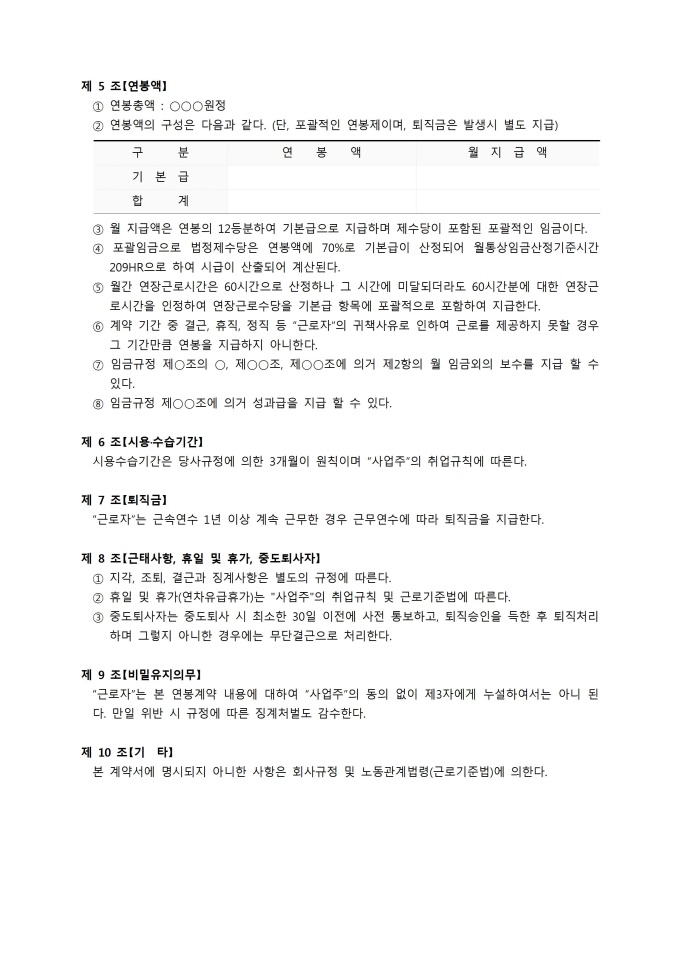 9,000원/월주 40시간 근로제를 기초로 하여 작성된 연봉근로계약서입니다. 포괄적인 연봉제이며 퇴직금을 별도로 지급한다는 내용으로 계약기간, 근로시간, 근무직종 등 10개 조항으로 구성되어있습니다. ※ 한글 파일은 알집(Zip)를 다운로드 받아주시기를 바랍니다.