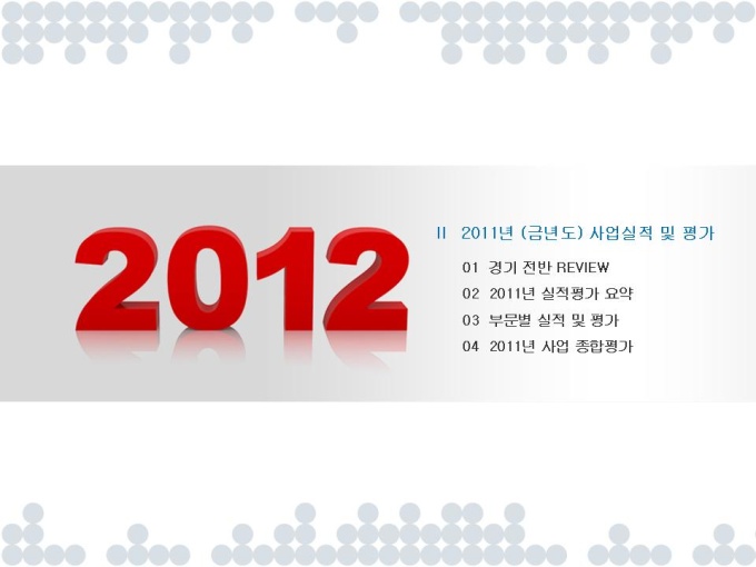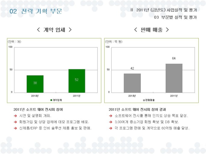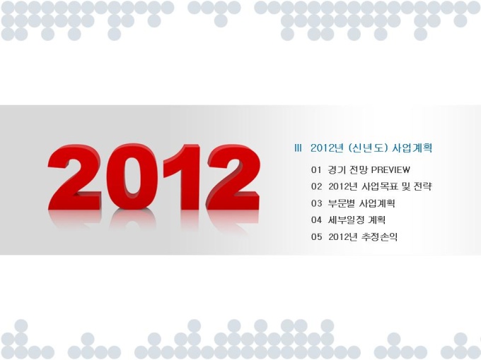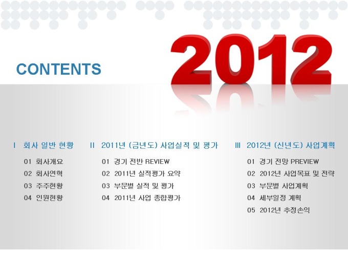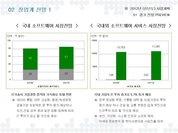 2012년 IT, 정보통신의 표준 신년도 사업계획서입니다. 실제 사업 사례로 들어 작성한 사업계획서 샘플이며, 어느 분야에도 적용이 되는 표준 목차로 구성되어 있습니다. 자신의 사업에 맞게 다양하게 활용하세요.