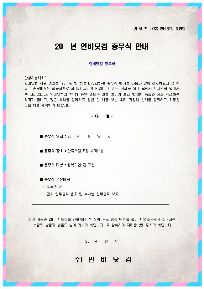 9,000원/월종무식 안내문(편지지 테두리)입니다. 한해를 마무리하고 새로운 시작을 다짐하는 종무식 행사에서 유용하게 사용할 수 있습니다. 상황에 맞게 다양하게 활용해보세요.