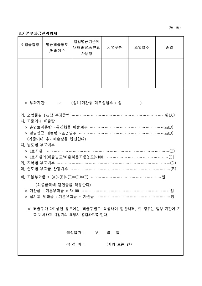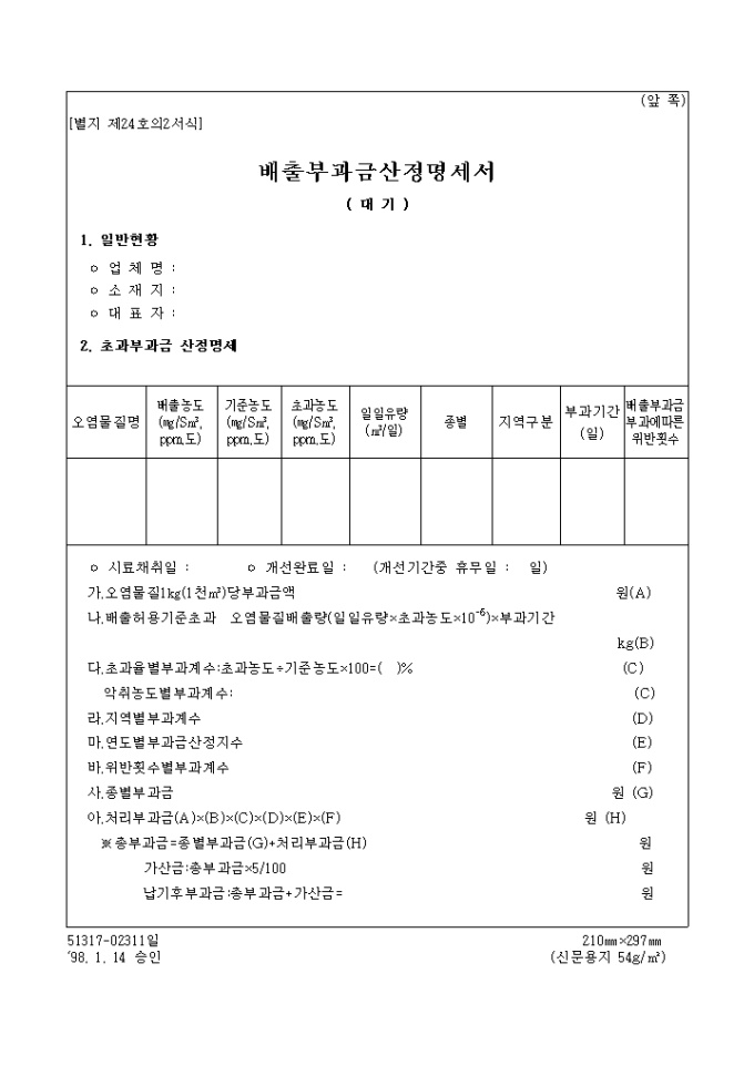 9,000원/월[별지 제24호의2서식]일반현황, 초과부과금 산정명세, 기본부과금산정명세등으로 구성된 배출부과금산정명세서 양식입니다.