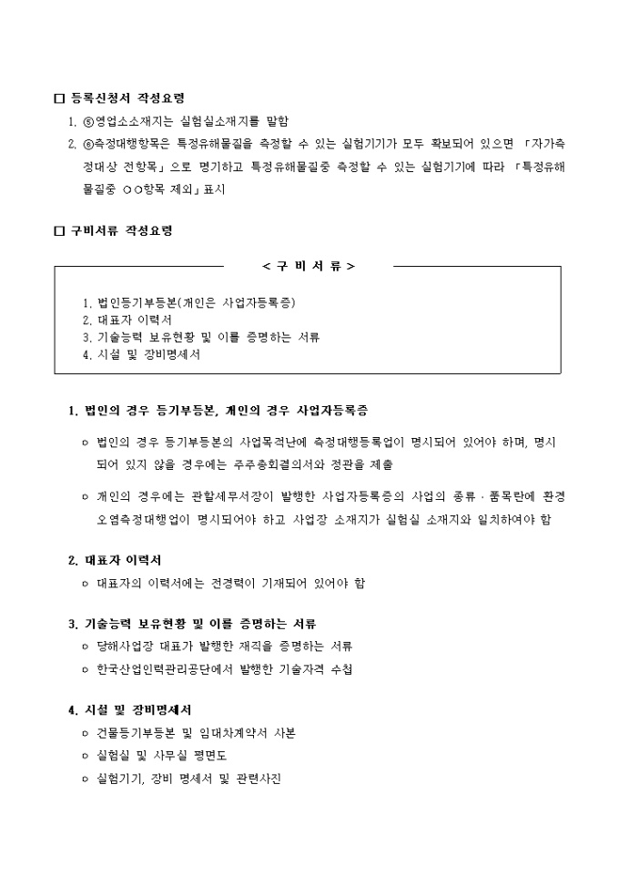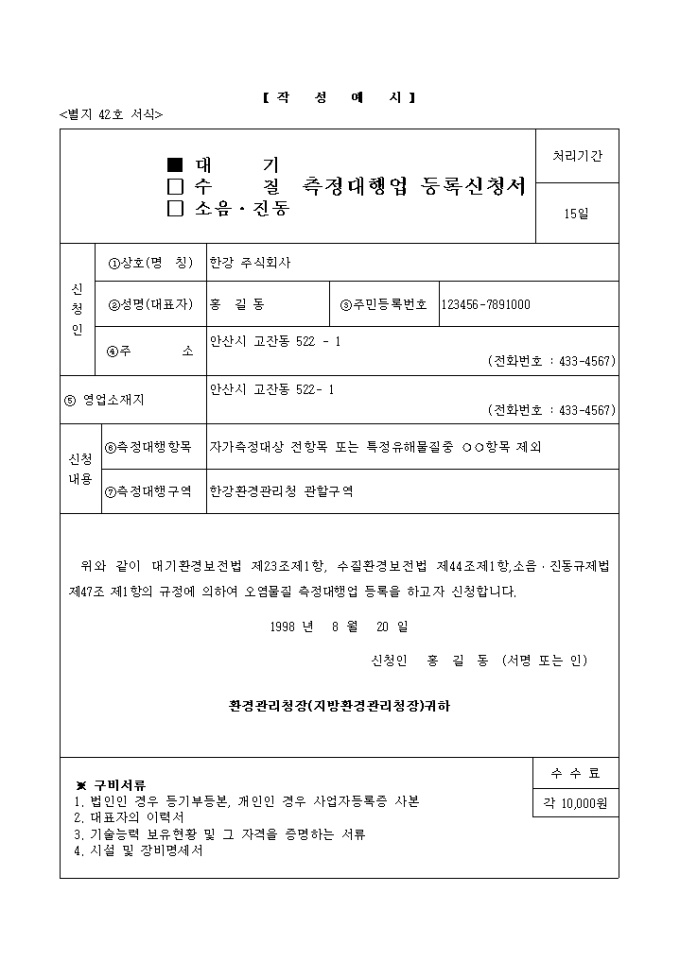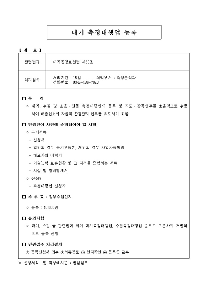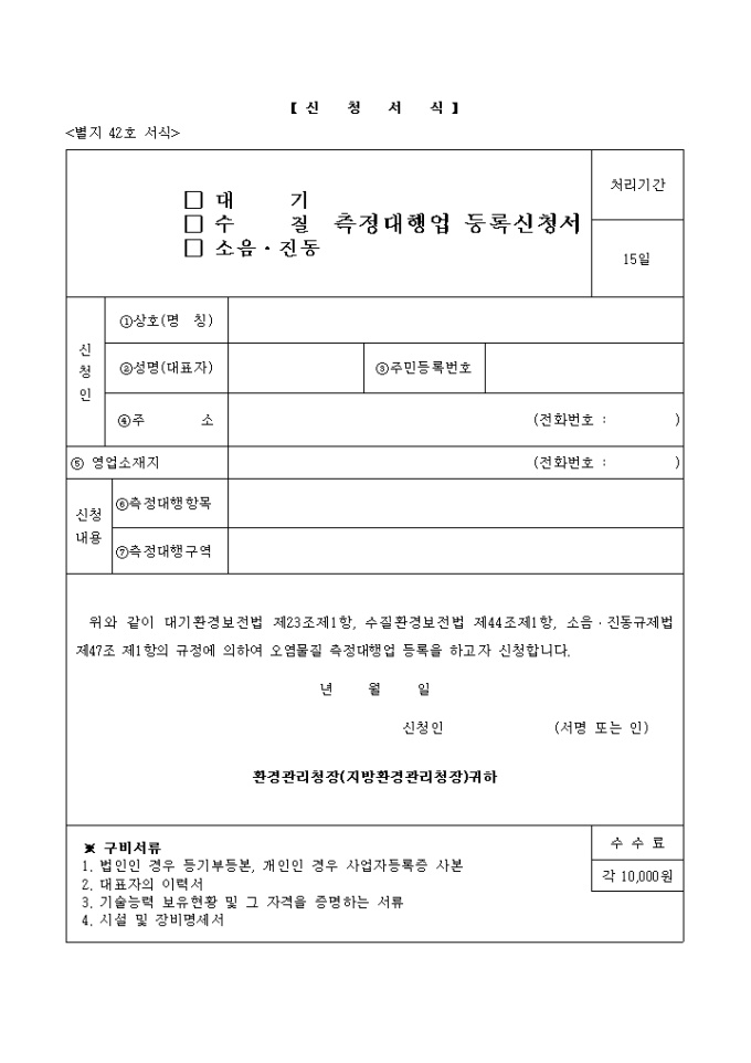 9,000원/월위와 같이 대기환경보전법 제23조제1항, 수질환경보전법 제44조제1항, 소음·진동규제법 제47조 제1항의 규정에 의하여 오염물질 측정대행업 등록을 하고자 할때 사용하는 양식입니다.