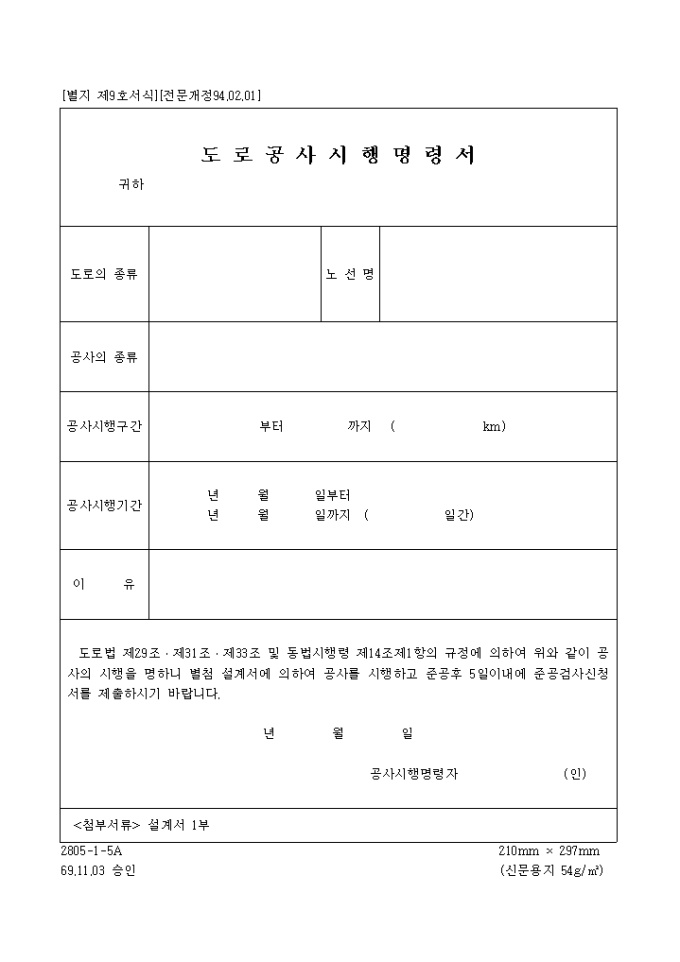 9,000원/월[별지 제9호서식] 도로법시행규칙09서식(69.11.03)-도로공사시행명령서 입니다. 도로법 제29조·제31조·제33조 및 동법시행령 제14조제1항의 규정에 의하여 위와 같이 공사의 시행을 명하니 별첨 설계서에 의하여 공사를 시행하고 준공후 5일이내에 준공검사신청서를 제출하시기 바랍니다. ...