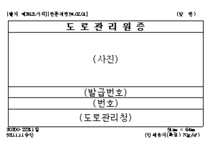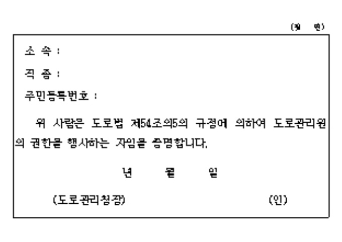 9,000원/월[별지 제36호서식] 도로법시행규칙36서식(93.11.11)-도로관리원증 입니다. 도로법 제54조의5의 규정에 의하여 도로관리원의 권한을 행사하는 자임을 증명하실때 사용하는 양식입니다.