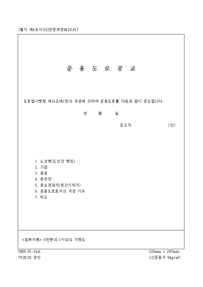 9,000원/월[별지 제4호서식] 도로법시행규칙04서식(79.09.26)-준용도로공고 입니다. 도로법시행령 제10조제1항의 규정에 의하여 준용도로를 다음과 같이 공고하실때 사용하는 양식입니다.