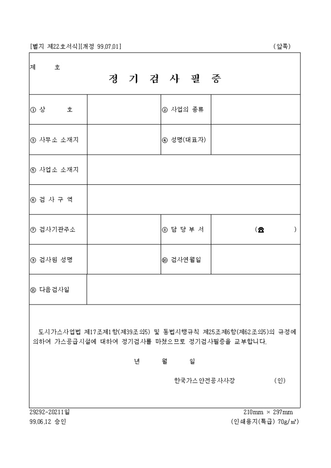 9,000원/월[별지 제22호서식] 도시가스사업법 제17조제1항(제39조의5) 및 동법시행규칙 제25조제6항(제62조의5)의 규정에 의하여 가스공급시설에 대하여 정기검사를 마쳤을 때 교부하는 정기검사필증 양식입니다.