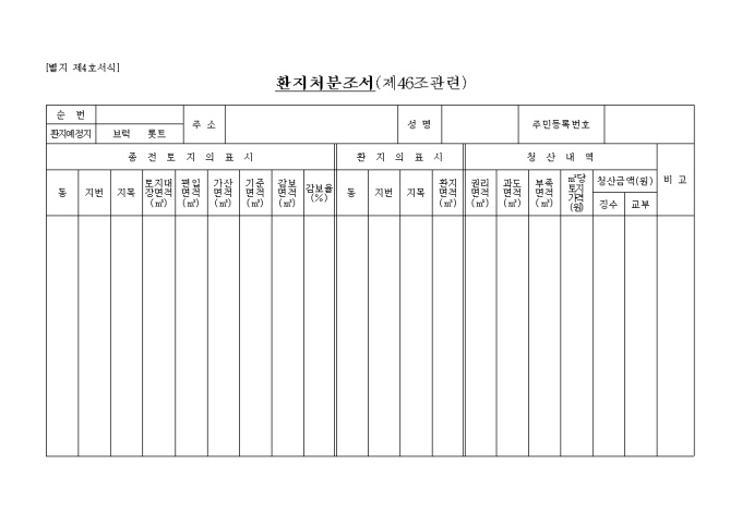 9,000원/월별지 제4호서식 종전토지의 표시, 환지의 표시, 청산내역으로 구성된 환지처분조서 양식입니다.