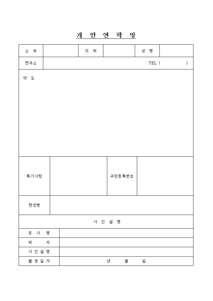 9,000원/월주소, 약도, 특기사항, 현장명, 사진설명등으로 구성되어 있는 개인연락망 양식입니다.