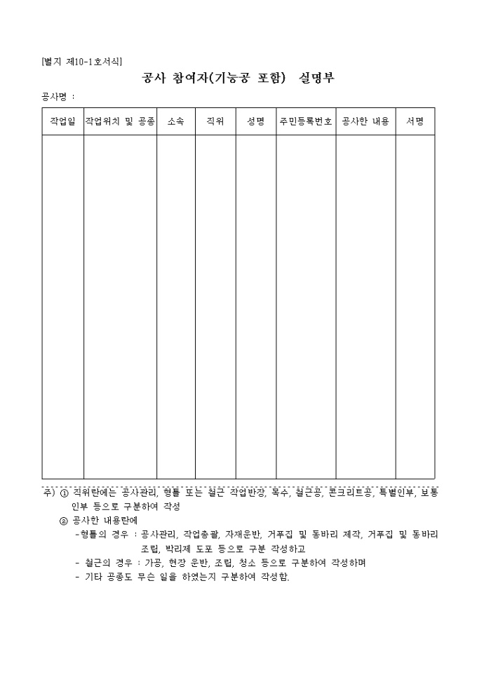 9,000원/월[별지 제10-1호서식] 공사참여자(기능공포함)실명부 입니다. 작업일, 작업위치 및 공종, 소속, 직위, 성명, 주민등록번호, 공사한 내용, 서명의 항목으로 구성된 양식입니다.