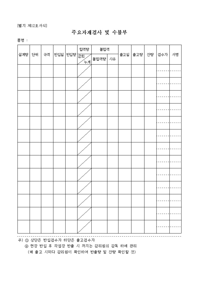 9,000원/월[별지 제12호서식] 주요자재검사및수불부 입니다. 설계량,단위,규격,반입일,반입량,합격량,불합격,출고일등의 항목으로 구성된 양식입니다.