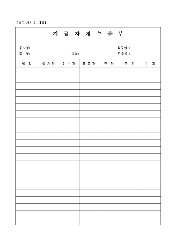 9,000원/월[별지 제21호 서식] 지급자재수불부 입니다. 일별 설계량, 인수량, 출고량, 잔량, 확인, 비고의 항목으로 구성된 양식입니다.